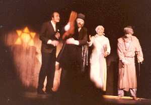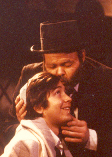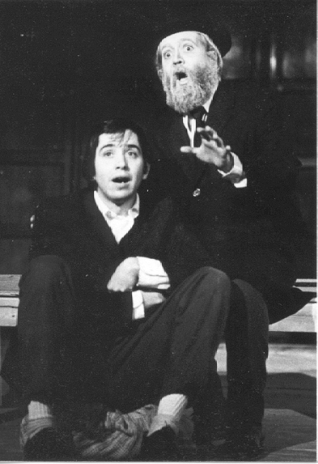 ![]() The aging Mendel (Ronald Edwards) knows he is going to die, but seeks to provide for his retarded son Itzak (Stephen Colantti) by sending him to his uncle in California. He needs $35 for the train ticket. ![]() No one will help Mendel (Morris White) and Itzak (Charles Osborne), except a poor rabbi (Jon Benac) who gives him a fur coat-- over the objections of Ruchel, the rabbi's wife (Natasha Lutov). ![]() Even then, Mendel must overcome the final obstacle at the train gate: Ginzburg, the Angel of Death (Ronald Edwards). Somehow, he does. ![]() Mendel kisses his son goodbye. |